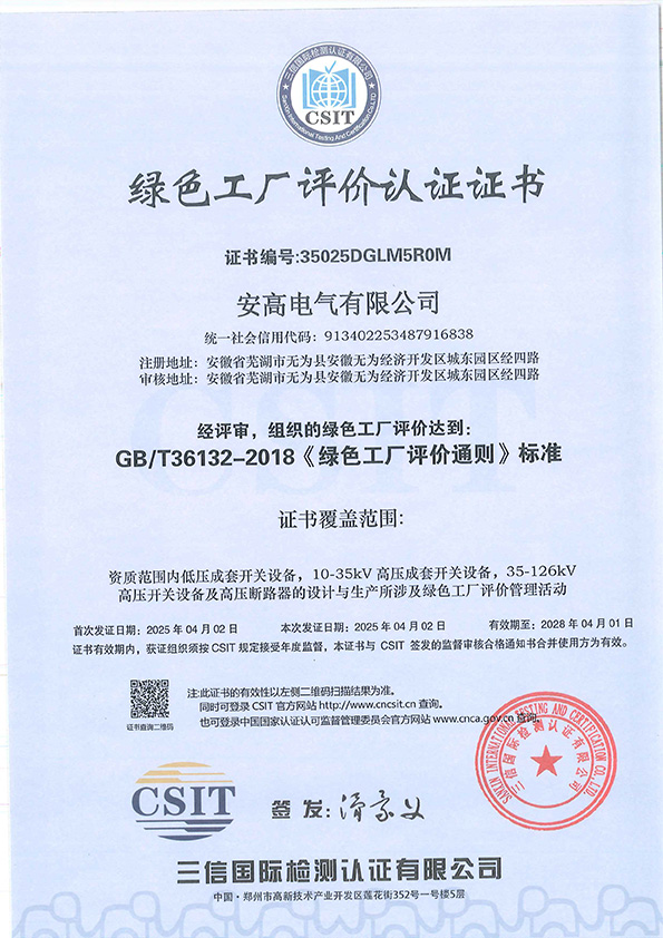 綠色工廠評(píng)價(jià)認(rèn)證證書(shū)
